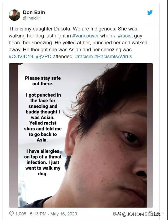 的Dakota鼻青脸肿。这还不算完,男子大声叫嚣:滚回亚洲去,你这个新冠肺炎患者!