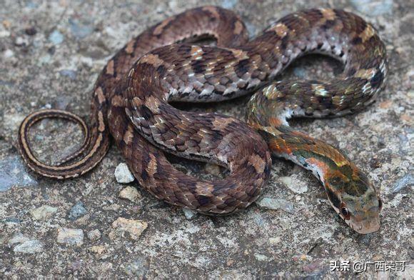虎斑颈槽蛇,微毒,吃小青蛙。从其毒液本身LD50来看的话,它的毒液也很毒,但它弱鸡的毒牙导致它对人注毒很困难。不过不可大意,日本已经有致死的案例出现了,国内目前没有载入档案的致死案例,你可别做第一个!