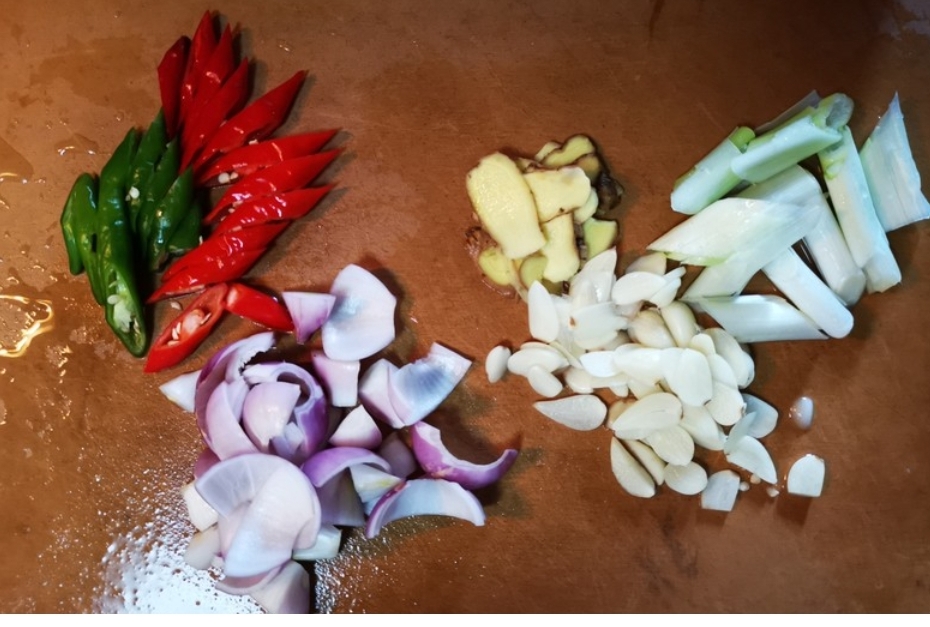 葱切断,姜蒜小洋葱切片,杭椒切斜刀备用