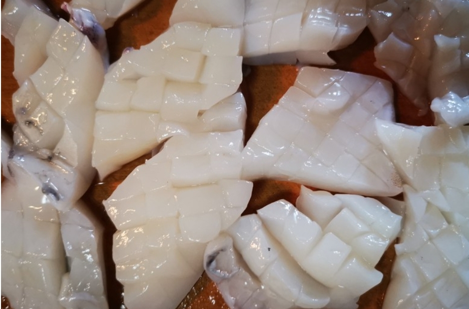 切掉头部,去掉内脏洗净,去掉背部骨头,用刀从里面划一口,骨头一下就能拿掉,头部去掉眼睛和软骨,切断,表面切花刀