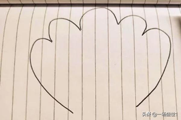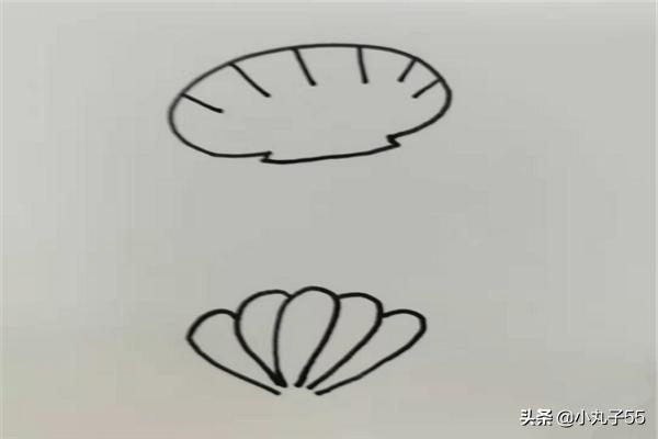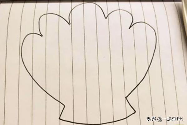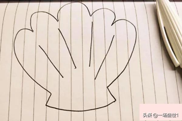 首先我们在纸上画出一个扇形,注意顶部画上不规则的波浪,在扇形的底部两侧画上两个角,完整的贝壳形状就出来了,