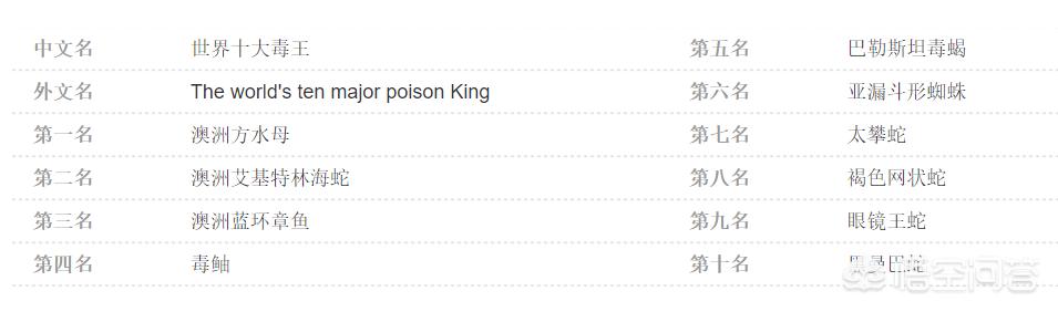 当然这个排名是来自美国《世界野生生物》杂志,综合各国学者的意见评选出来的,所以具有一定的参考性。对于这个毒生物的排行榜,虽然很多也存在争议性,但是基本上争议的就是其他生物的一个毒素强度,我们就暂时以这个排名为主,而除了艾基特林海蛇之外,还有四种蛇进入到了10大毒物排行榜,分别为太攀蛇,褐色网状蛇, 眼镜王蛇,黑曼巴蛇,毒素影响排列一次减弱,这就是大概的情况。