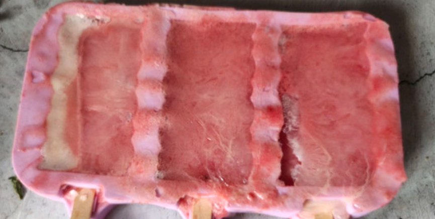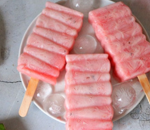 将做好的芒果酸奶雪糕和西瓜雪糕放入冰箱冷冻8小时以上,褪去模具即可食用。