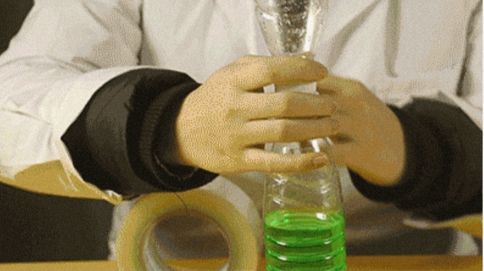 将有水的瓶子倒置顶部,观察水流(缓慢),接着用力旋转塑料瓶,形成漩涡。这时你可以观察到,瓶中神奇地产生了“水龙卷”。