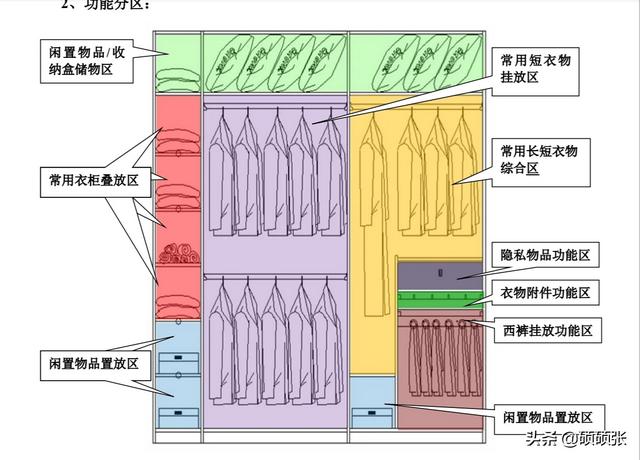 2、各空间的基本分布大衣柜整个的空间分布大致分为上、中、下三个区域: