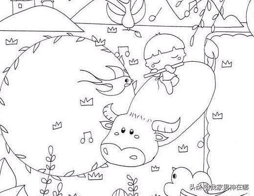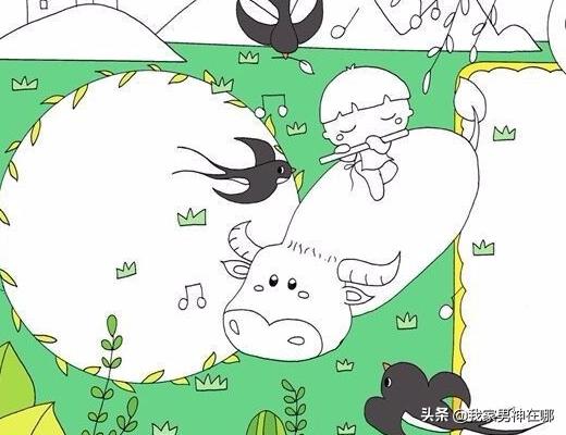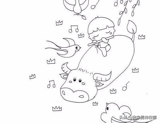 1、首先在纸的中间位置画一头卧在地上的水牛,上面坐着一个吹笛子的小朋友,周围画上一些小草和音符,加上三只燕子,继续在上面画上三根柳条。