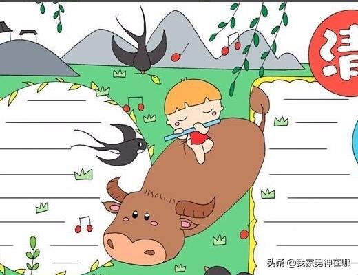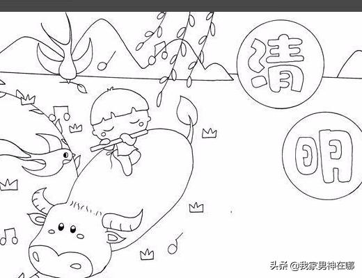 5、再给黄牛和小朋友上色,远山涂灰色,柳叶涂成墨绿色,音符涂红色,再给报头涂上红色和蓝色,最后在空白边框里画上整齐的文字栏,关于清明节的手抄报就画好了。