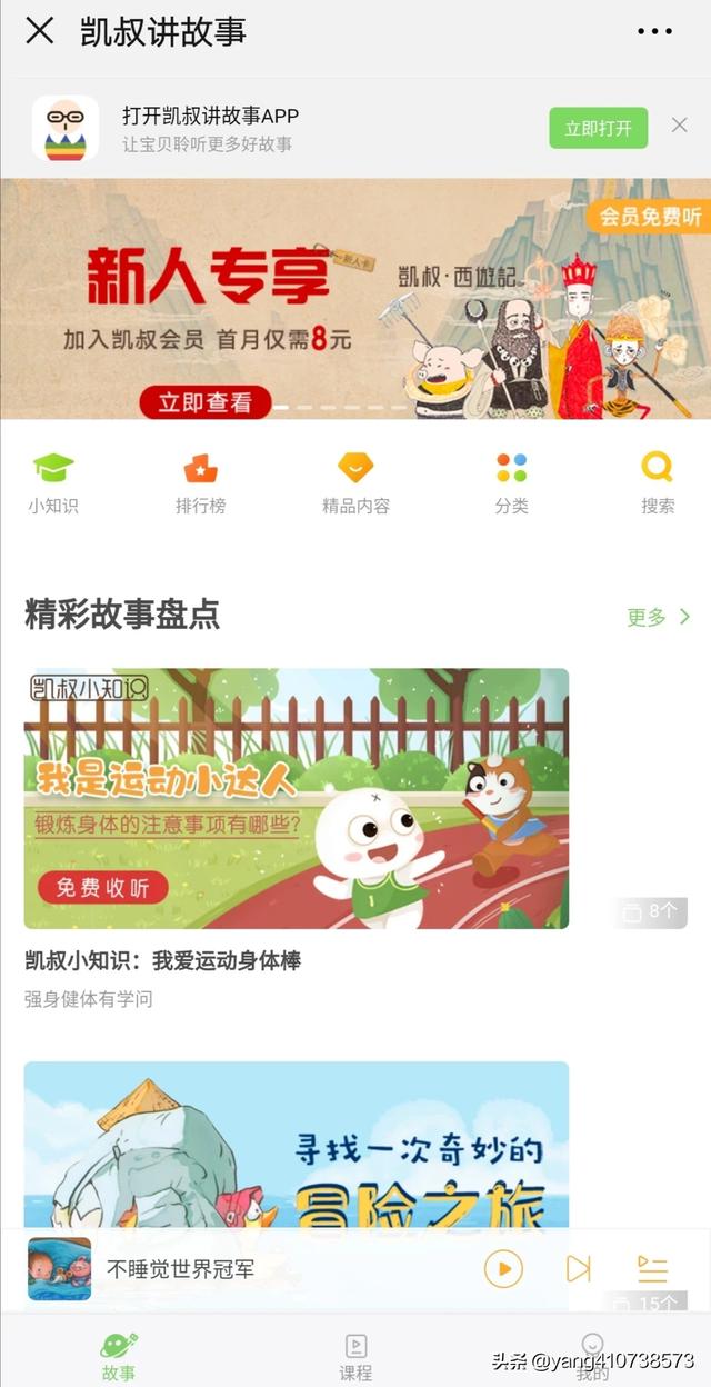 我家孩子小时候是用《凯叔讲故事》微信小程序,这里有许多凯叔讲的免费故事。故事讲的很生动,而且很多是连载的故事,孩子很喜欢。《凯叔讲故事》有微信小程序,也有APP,您可以根据自己的需要选择。