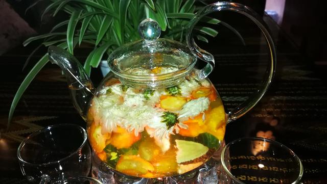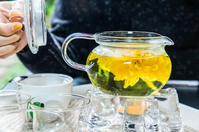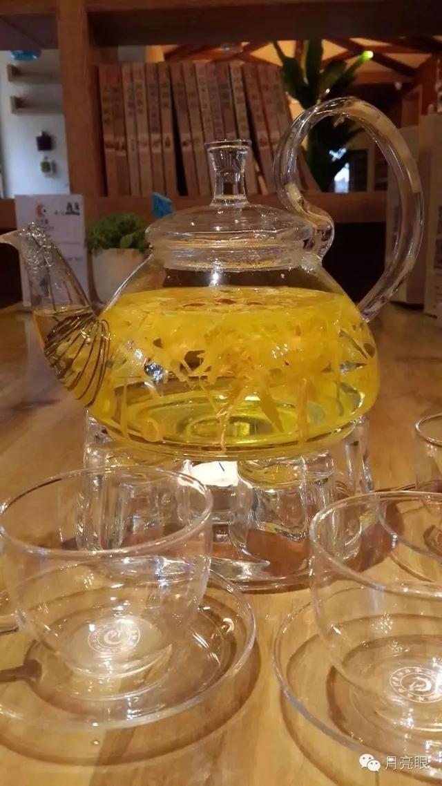 ?3、云朵金菊花茶:工作压力大,天天看手机看电脑的你来一壶云朵金菊花茶,看着一朵美丽的菊花在水中盛开,心情就像花瓣一样慢慢的舒展,愉悦的喝菊花茶,简单有效的减压,菊花还对缓解视力疲劳,视力模糊有很好的疗效。