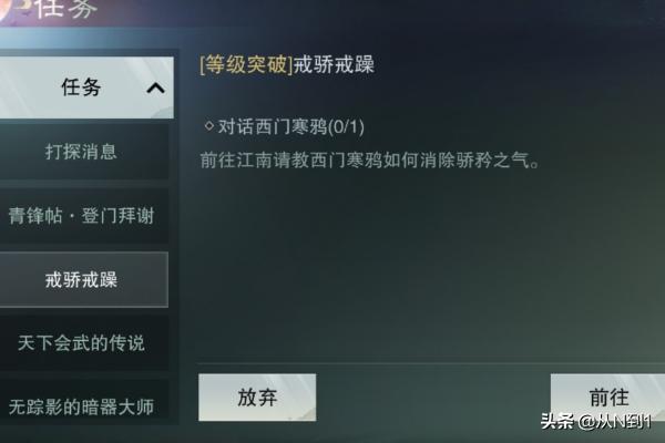 2、接下来我们再次点开任务栏,找到戒骄戒躁这个任务点击前往。便会自动寻路前往找到一个叫做西门寒鸦的NPC。接下来我们与他进行战斗,将其击败。